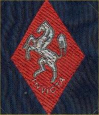 On a lozenge gules a white horse forcene and in base the word INVICTA, lettered white