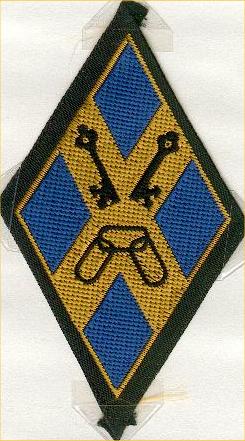 A Lozenge azure; on a saltire or two keys in chief the wards downwards and outwards, above tree chain links linked, sable