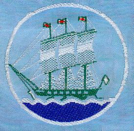 A roundel azure, thereon a three masted schooner vert, rigged argent sailes white, flags azure charged with a cross throughout gules, all fimbriated argent.