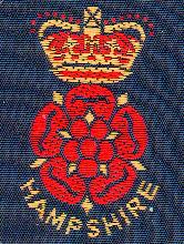 A rose gules barbed or surmounted by a royal crown. Inscribed beneath on a scroll HAMPSHIRE
