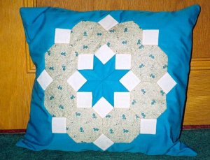 I have made a patchwork cushion to go on my chair in the craft room. The cushion is patchwork on both the front and back in blues. Each side consists of 32 pieces, I have used lozenges, squares and octagons. The completed patchwork has then been attached to a homemade cushion cover.