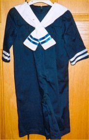 Made a christening outfit for my son. Have adapted the pattern slightly so that I had the collar style I wanted with both long sleeves and legs. The pattern is for an all in one with set in sleeves and sailor style collar, the outfit has a zip fastening. Although the pattern was designed with girls in mind I omitted the elasticated cuffs and ankles so that it looked a little less feminine. I have used cotton drill in navy and white with satin ribbon trimmings.