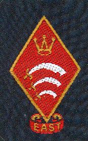 On a lozenge gules three seaxes in pale white pommelled and hilted or. In chief a Saxon Crown or above a scroll inscribed with the word EAST