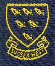 On a shield azure, six martlets or, three, two and one. Inscribed beneath on a scroll azure, SUSSEX WEST lettered or.