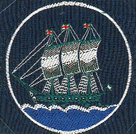 A roundel azure, thereon a three masted schooner vert, rigged argent sailes white, flags azure charged with a cross throughout gules, all fimbriated argent.