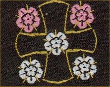 On a cross patee sable betweem four roses 2 in chief gules and 2 in base white at fess point another white rose