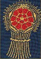 A garb bound or behind a Lancashire rose gules.