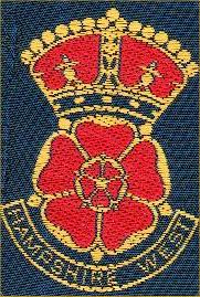 A rose gules barbed or surmounted by a royal crown. Inscribed beneath on a scroll HAMPSHIRE